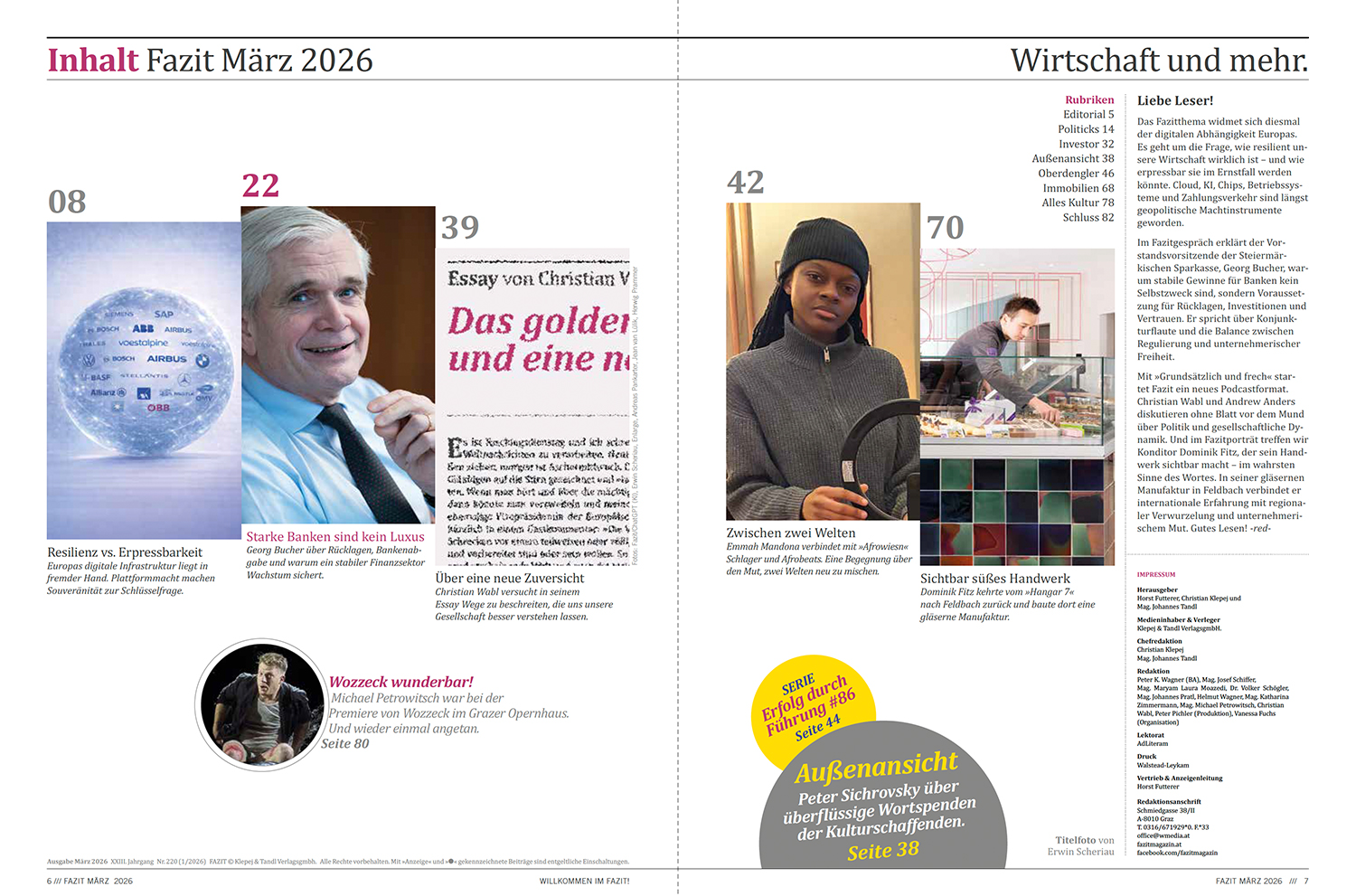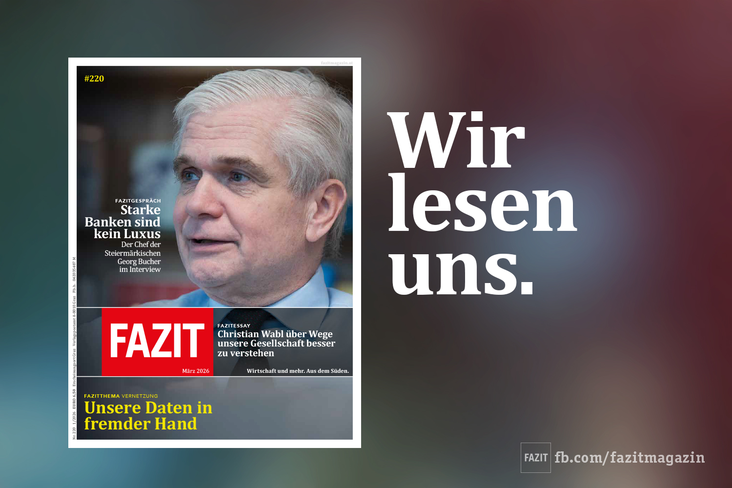 Das Fazitthema widmet sich diesmal der digitalen Abhängigkeit Europas. Dabei geht es vor allem um die Frage, wie resilient unsere Wirtschaft wirklich ist. Im Fazitgespräch erklärt der Vorstandsvorsitzende der Steiermärkischen Sparkasse, Georg Bucher, warum stabile Gewinne für Banken kein Selbstzweck sind, sondern Voraussetzung für Rücklagen, Investitionen und Vertrauen. Das und mehr lesen Sie im Fazit 220. Ab Mitte März auch online. [Coverfoto von Erwin Scheriau.]