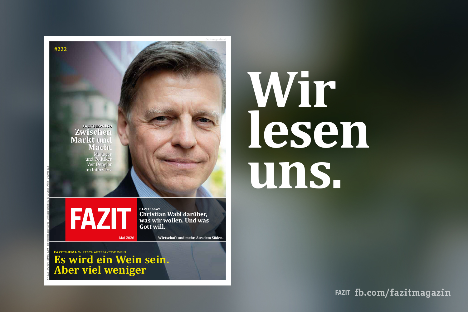 Im Fazitthema geht es um die aktuelle Weinkrise. Warum steirischer Wein trotz globaler Absatzkrise, Wirtshaussterben und neuer Trinkkultur gute Karten hat. Und im Fazitgespräch erklärt Exmanager Veit Dengler, warum Österreich so schwer in Bewegung kommt und Reformen ständig verschleppt werden. Das und mehr lesen Sie im Fazit 222. Ab Mitte Mai auch online. [Coverfoto von Marija Kanizaj.]