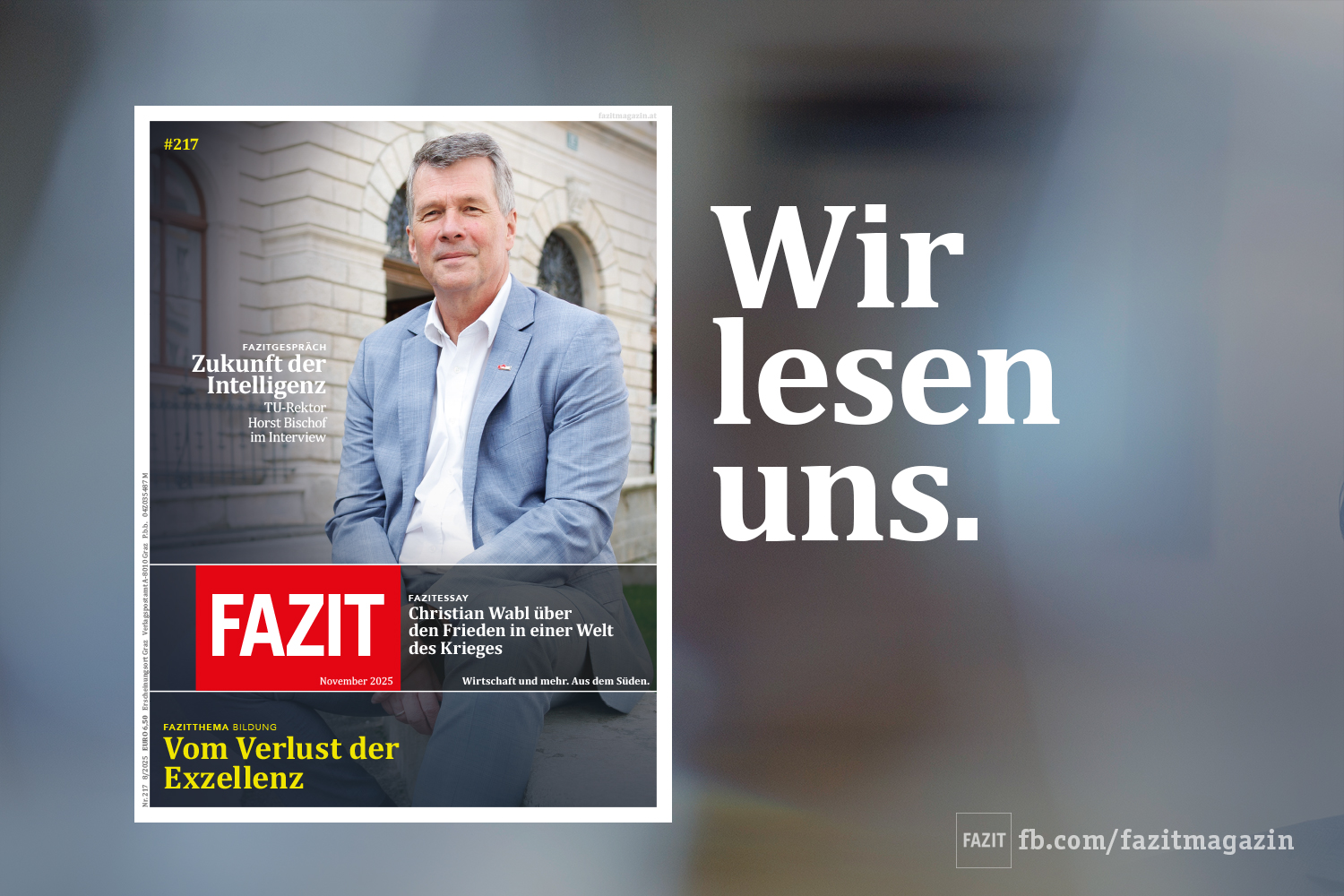 Im Fazitthema dieser Ausgabe beleuchten wir, warum Bildung wieder zum zentralen Wettbewerbsfaktor werden muss, und was Politik, Wirtschaft und Gesellschaft dazu beitragen können. Und das Fazitgespräch führten wir – durchaus passend zum Fazitthema – mit dem Rektor der Technischen Universität Graz, Horst Bischof über die »Zukunft der Intelligenz«. Das uns mehr im Fazit 217.